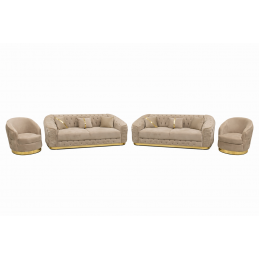 Acest set de living elegant în stil Chesterfield aduce un plus de rafinament și confort în orice locuință. Designul clasic tapitat cu butoni, combinat cu tapițeria din catifea premium bej și accentele aurii subtile, creează un ambient sofisticat și modern.