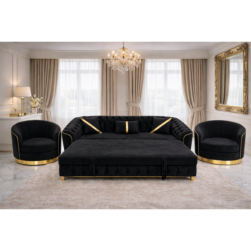 Setul este compus din canapea extensibilă și două fotolii confortabile, fiind ideal pentru livinguri elegante sau pentru spații destinate relaxării și socializării. Canapeaua se transformă rapid într-un pat confortabil, oferind o soluție practică pentru oaspeți.