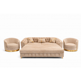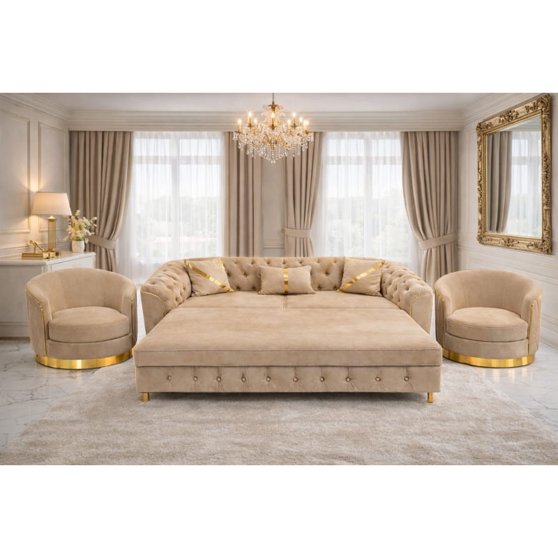 Acest set de living elegant în stil Chesterfield aduce un plus de rafinament și confort în orice locuință. Designul clasic tapitat cu butoni, combinat cu tapițeria din catifea premium bej și accentele aurii subtile, creează un ambient sofisticat și modern.