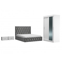 Setul dormitor Ana va ofera buna dispozitie si eleganta .Designul dormitorului va ofera o atmosfera calda si relaxanta. Setul include Pat tapitat Ana gri , Dressing alb usi glisante cu oglinda si 2 noptiere . Patul este potrivit atat pentru saltea cu o fata cat si pentru saltele cu doua fete.