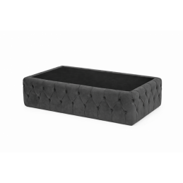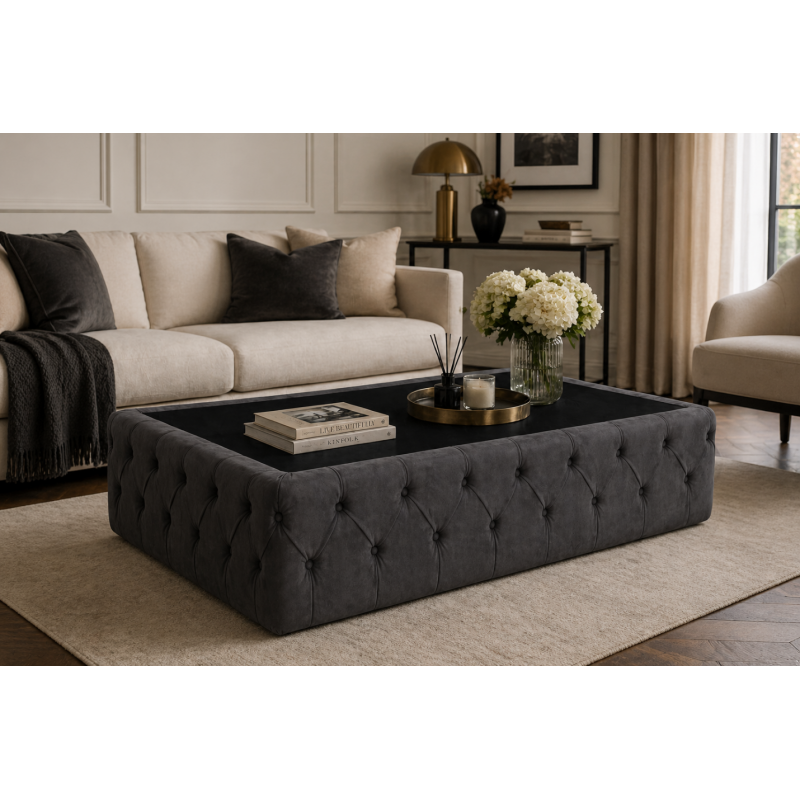 Masuță de cafea care îmbină luxul clasic cu funcționalitatea modernă, aducând o notă de eleganță în orice living.Cu un design stil Chesterfield, masuța este tapitată cu catifea premium si nasturi catifea,iar blatul este realizat din Sticla securizata conferind durabilitate și ușurință în întreținere.