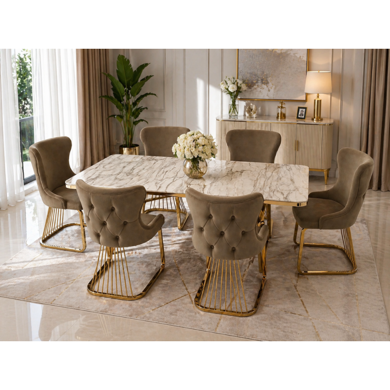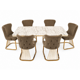 Masa impresionează prin designul său contemporan, cu blat generos și rezistent, susținut de o bază metalică stabilă în finisaj auriu, care adaugă un aer premium întregului ansamblu. Scaunele sunt tapițate cu material textil catifelat într-o nuanță elegantă de mustar, având spătar ergonomic și detalii rafinate ce oferă atât confort, cât și un aspect luxos.