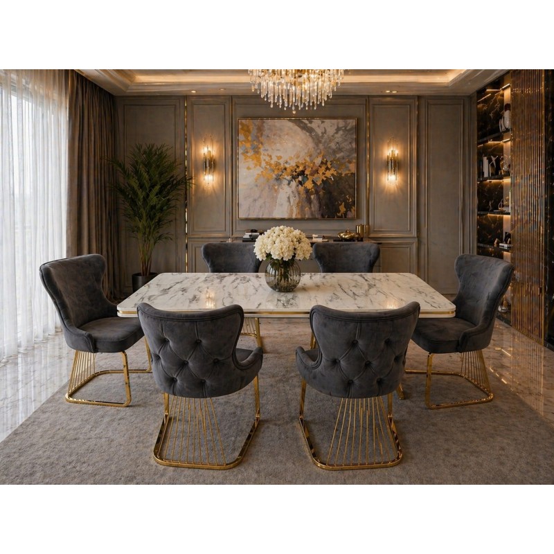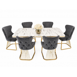 Masa impresionează prin designul său contemporan, cu blat generos și rezistent, susținut de o bază metalică stabilă în finisaj auriu, care adaugă un aer premium întregului ansamblu. Scaunele sunt tapițate cu material textil catifelat într-o nuanță elegantă de gri antracit având spătar ergonomic și detalii rafinate ce oferă atât confort, cât și un aspect luxos.