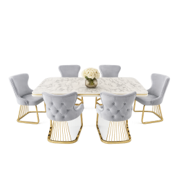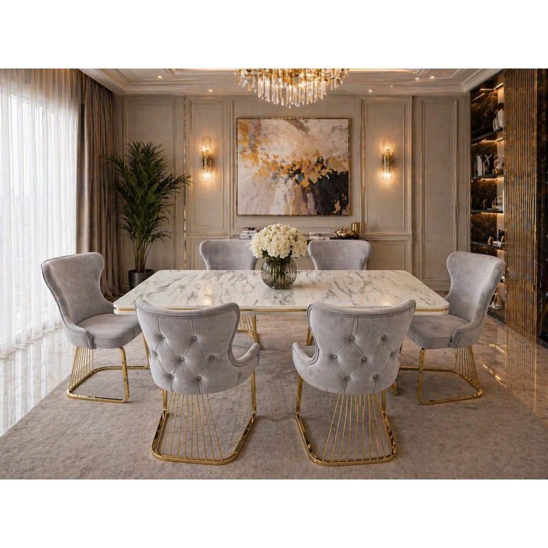 Masa impresionează prin designul său contemporan, cu blat generos și rezistent, susținut de o bază metalică stabilă în finisaj auriu, care adaugă un aer premium întregului ansamblu. Scaunele sunt tapițate cu material textil catifelat într-o nuanță elegantă de gri având spătar ergonomic și detalii rafinate ce oferă atât confort, cât și un aspect luxos.