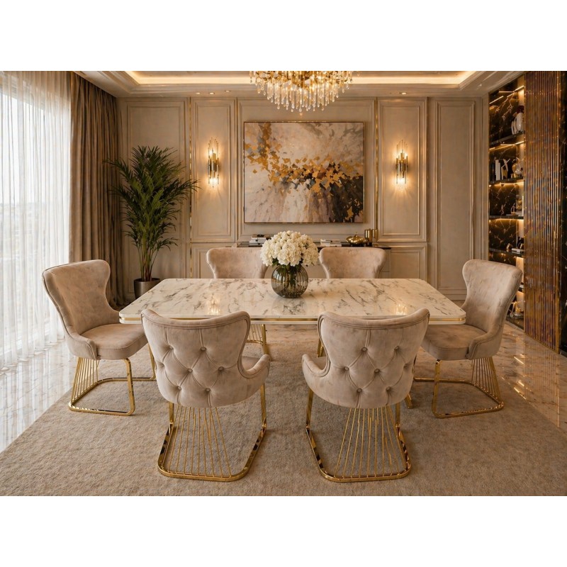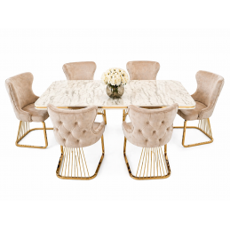 Masa impresionează prin designul său contemporan, cu blat generos și rezistent, susținut de o bază metalică stabilă în finisaj auriu, care adaugă un aer premium întregului ansamblu. Scaunele sunt tapițate cu material textil catifelat într-o nuanță elegantă de bej având spătar ergonomic și detalii rafinate ce oferă atât confort, cât și un aspect luxos.