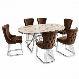 Masa impresionează prin designul său contemporan, cu blat generos și rezistent, susținut de o bază metalică stabilă în finisaj argintiu, care adaugă un aer premium întregului ansamblu. Scaunele sunt tapițate cu material textil catifelat într-o nuanță elegantă de maro, având spătar ergonomic și detalii rafinate ce oferă atât confort, cât și un aspect luxos.