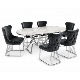 10Set masă dining lux ovala MDF 170x90 cm fixa cu 6 scaune tapițate – design elegant cu accente argintii