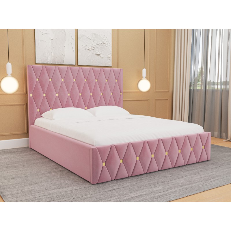 Pat tapitat Ana roz 160x200 cm , catifea premium si insertii aurii.